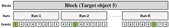 The EEG data from the dataset experiment is collected in the form of blocks runs, and events [42]. Each session data in this phase consists of 20 blocks, each for 10 different runs of the experimental condition. Each run comprises eight different objects; each one flashes with the green light in a randomized manner. Each object’s highlight (flash) appears with a 200 ms inter-stimulus interval. Each flash lasted 100 ms. The pictorial illustration of blocks, runs, and events is shown in Figure 4. During this phase, the participants were explicitly instructed to count the occurrences of one of the already specified objects that would flash during each block. The target object was the one that was clearly mentioned to the participant during this step. The participants were asked to confirm the object after each run (behavioral control). The data collected during this phase are called training data.