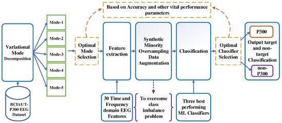 In the previously proposed methods for the detection of P300 in ASD subjects, Zhao et al. [28] employed linear discriminant analysis (LDA), support vector machine (SVM), and convolutional neural network (CNN) with a novel and personalized filter design and obtained an accuracy of 67.2%. Adama et al. [29] used time domain features and the Pearson correlation coefficient to obtain an accuracy of 70%. Bipra Chatterjee et al. [30] leveraged temporal features and used three classifiers, Bayes LDA, random under-sampling boosting (RUSBOOST), and CNN, out of which BLDA outperformed others, giving an accuracy of 76.3%. Miladinovic et al. [31] applied logistic regression based on variational Bayesian inference (VB-ARD) and obtained an accuracy of 80.3%. Bittencourt-Villalpando et al. [32] trained linear LDA using augmented data obtained by pseudo-random averaging and achieved an accuracy of 81.2%. Lucia de Arancibia et al. [33] extracted time domain and CWT features from the data and explored LDA, linear SVM (LSVM), and radial SVM (RSVM) classifiers. Among these, LDA gave better accuracy of 82%. Santamaría-Vázquez et al. [34] utilized CNN- bidirectional long short-term memory (CNN-BLSTM) and achieved an accuracy of 84.3%. Borra et al. [35] used CNN based on the EEG-NET architecture [36] proposed by Lawhern et al. and obtained an accuracy of 92.3%. None of the previous approaches in the literature explored the application of adaptive signal decomposition techniques for P300 classification in ASD subjects. Hence, the present study explored the adaptive signal decomposition method for P300 classification in a BCI for ASD.