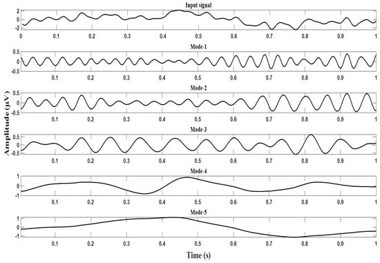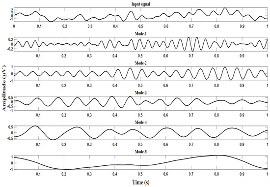 signal identification. The EEG signal is decomposed into five modes using VMD. Thirty linear and