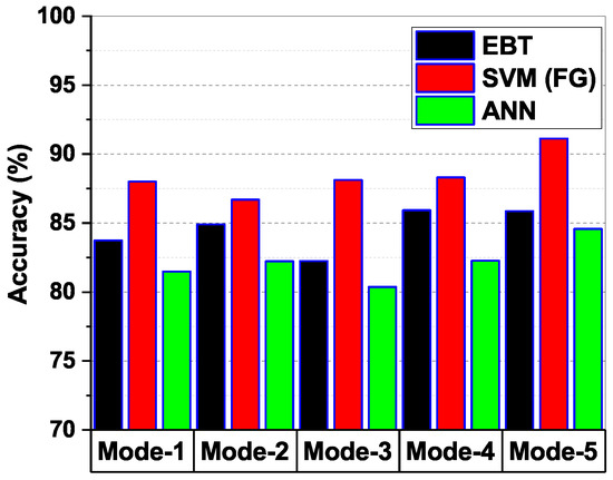Figure 12 shows the average accuracy obtained from the testing data of each subject using the three classifiers EBT, SVM (FG), and ANN on all the five modes of VMD. From Figure 12, it can be seen that the SVM (FG) classifier performed better than other classifiers. It can also be inferred that among all the modes, the accuracy of Mode-5 was better compared to other modes using SVM (FG) classifier. The average classification accuracy of the SVM (FG) classifier on Mode-5 was 91.12 %. Hence, it can be inferred that the VMD-SVM combination on Mode-5 is optimal. According to [54], P300 is commonly found in low-frequency brain wave signals. It can be seen from Figure 8 that Mode-5 is a low-frequency signal compared to other modes. These findings thus strongly support the findings in [54] that P300 signals occur in lower frequency bands on the EEG signal.