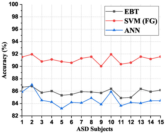 Figure 13 shows a comparison of the subject-wise average accuracy for the classifiers considered in the present work. It is evident from Figure 13 that the SVM (FG) classifier gave consistently good classification accuracies irrespective of the subjects considered when compared to EBT and ANN classifiers. This also illustrates the stability of the performance of the SVM (FG) classifier.