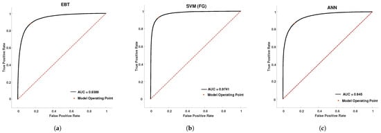 ROC curves for cross-validated testing data of subject-2 Mode-5 signal for (a) the EBT classifier, (b) SVM (FG) classifier, and (c) ANN classifier.