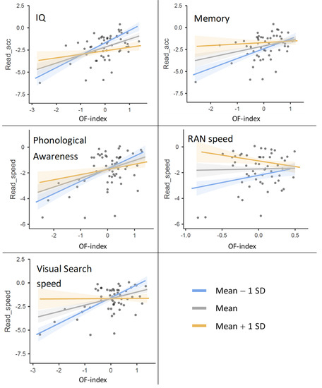 Each plot shows the interaction between one specific predictor (named in the top-left corner of the plot) and other predictors in determining reading performance. The latter was measured in terms of either reading accuracy (“acc”) or reading speed, and is reported as a z-score on the vertical axis. Dots represent single participants. The specific predictor varies across colors (different regression lines in the plot), while the other predictors are shown as a composite score, the “other factors” (OF) index, reported on the horizontal axis (see text for computational details). For instance, the first plot reports the effect by predictors other than IQ as the slope of the regression lines, and the separate regression lines show different levels of IQ: the gray line shows performance by subjects whose IQ was at the sample mean, the blue line shows performance by subjects whose IQ was 1 SD below the sample mean (−1 SD), and the yellow line shows performance by subjects whose IQ was 1 SD above the sample mean (+1 SD). Shaded regions around the regression lines show the standard error of the mean [73]. In all cases, the effect of the single predictor (visible as the gap between the yellow and the blue line) is significantly amplified when other cognitive performances are low (low OF index, on the X axis).