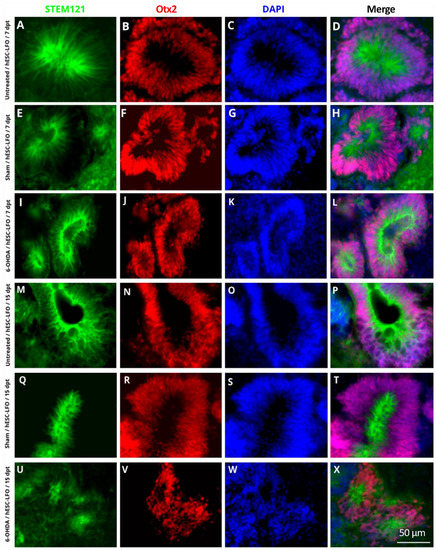 In ESCs, Lmx1a induces the mesencephalic specification throughout an autoregulatory loop with Wnt1; subsequently, Lmx1a-Wnt directly regulates Otx2, a downstream transcription factor also required for midbrain development [34]. Therefore, immunofluorescent assays were conducted to determine whether Lmx1a and Oxt2 transcription factors were expressed in the neural rosette formation. Indeed, Lmx1a (Figure 2) and Otx2 (Figure 3) were consistently observed in the nuclei of neural rosettes in STEM121-positive cells at 7 dpt (Figure 2A–L and Figure 3A–L) and 15 dpt (Figure 2M–X and Figure 3M–X) in untreated (Figure 2A–D,M–P and Figure 3A–D,M–P), sham (Figure 2E–H,Q–T and Figure 3E–H,Q–T), and 6-OHDA (Figure 2I–L,U–X and Figure 3I–L,U–X) rats. However, it was not possible to determine whether the expression of Lmx1a and Otx2 derived from the endogenous locus or the introduced transgene.