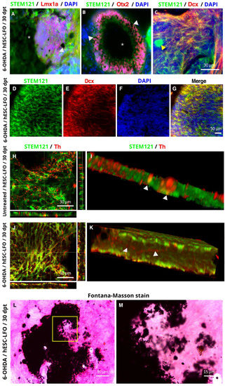 Furthermore, in the most advanced differentiated stage studied (30 dpt), in addition to Lmx1a, Otx2, and Th expression, the neuromelanin pigment deposits found in the grafted area were a direct indication of dopamine oxidation, suggesting that dopamine synthesis by the grafted cells is taking place, which is an indispensable feature of dopaminergic neurons that has also been observed in organoids directed towards a dopaminergic phenotype [43,44].