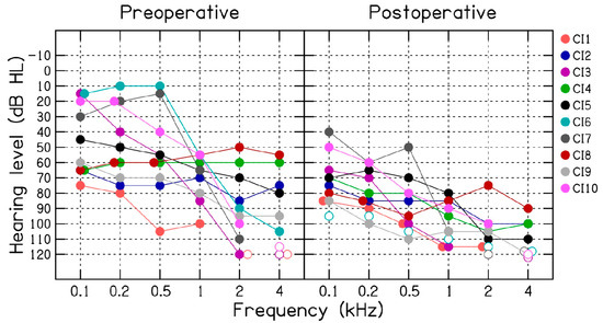 Pre and postoperative audiometric air-conduction thresholds (dB HL) measured for the ten (CI1 to CI10) cochlear implant patients.