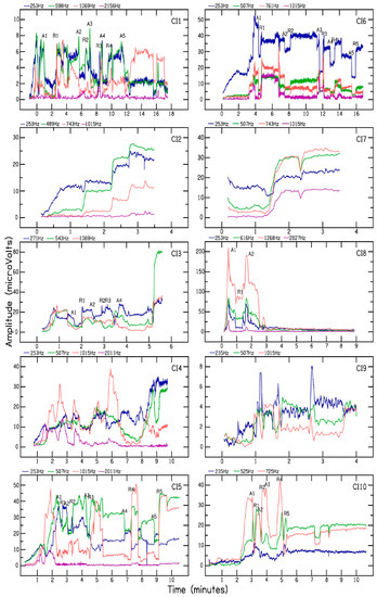 Intraoperative multi-frequency CM tracings measured for ten cochlear implant patients. The abscissa shows time (min) and the ordinate shows CM amplitude (µV). The frequencies used to elicit CMs are shown above each plot.