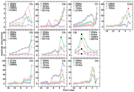 Intraoperative multi-frequency electrodes scan for the ten cochlear implant patients. The abscissa shows electrodes and the ordinate shows CM amplitude (µV). For patient CI8, black filled circles show correlated drops in CM amplitude for the four test frequencies. For patients CI5 (507 Hz) and CI10 (725 Hz), filled circles show phase reversal near electrode 2.