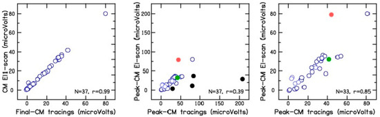 To rule out electrode migration, after electrode insertion was complete, CM amplitude recorded at the end of electrode placement was compared with the CM amplitude measured during the electrode scan on electrode 1 (Figure 5, left panel). A correlation of 0.99 was obtained between the two different CM measurements for the 37 test frequencies across the 10 CI patients. This suggests minimal or no changes in electrode position after completion of electrode placement and the measurement of electrode scan. To differentiate between electrode insertion trauma from electrode advancement beyond the site(s) of CM generation as the cause for CM drops, the peak CM amplitude measured during electrode placement was compared with the peak CM amplitude measured during electrode scan. The results show a correlation of 0.39 (Figure 5, middle panel) between the peak CM amplitude measured during and after CI electrode placement. Note that patient CI8 showed large differences between the peak CM amplitude measured during electrode placement and the electrode scans (Figure 5, middle panel, black circles). This patient also shows a correlated decrease in CM signal for the four test frequencies near electrode 11, which may be suggestive of cochlear trauma or basilar membrane involvement (Figure 3, CI8, black circles). The peak CM amplitude from the tracings and the electrode scan showed an improved correlation of 0.85 when the data for patient CI8 were excluded from the analysis (Figure 5, right panel). These results suggests that the decrease in CM tracings observed during electrode placement can be at least partially and, in some cases, completely attributed to the advancement of the recording electrode beyond the multiple sites of CM generation along the basilar membrane.