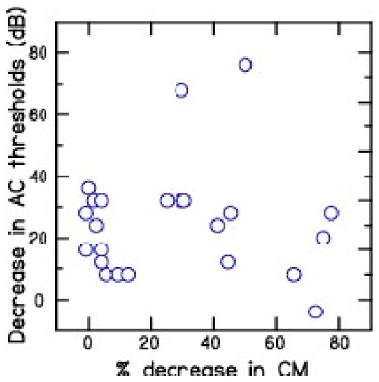 Comparison between percent decrease in CM (µV) amplitude and postoperative air-conduction thresholds (dB HL) across the frequency ranges of 250 to 800 Hz for the 10 cochlear implant patients.
