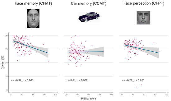 The associations between PI20DK total scores and scores on the three performance tests are presented in scatter plots in Figure 1. PI20DK total scores correlated significantly with performance on the CFMT (p < 0.001) and the CFPT (p = 0.023), but not with CCMT performance (p = 0.907). (Note that there were two outliers on the CFPT. These data were not excluded as per the preregistration. However, if these data points are excluded from the analysis, the correlation with PI20DK is r = −0.17, p = 0.072). The r-to-z transformed difference between the PI20DK-CFMT and PI20DK-CCMT correlation coefficients was significant (z = 2.84, p = 0.005, two-tailed). The exploratory analysis of the r-to-z transformed difference between the PI20DK-CFMT and PI20DK-CFPT correlation coefficients was not significant (z = 1.30, p = 0.19, two-tailed).