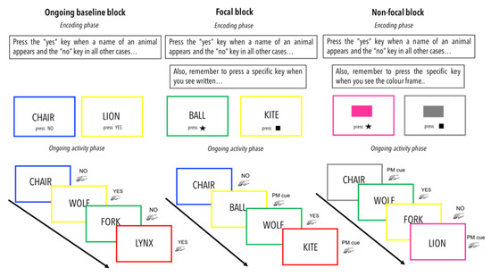 Representation of the PM task in each block condition (baseline, focal and non-focal). All the blocks started with an encoding phase succeeded by the ongoing activity alone (ongoing baseline block) or the ongoing activity with the PM intention implemented (focal and non-focal blocks). The trial sequence in each block is signaled by the black arrow. In the focal and non-focal conditions PM cues appeared intercalated.