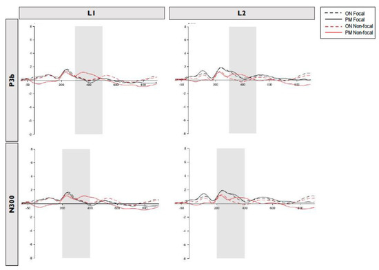 For each ERP component (P3b and N300), mean amplitudes across electrodes and conditions were averaged and adhered to a 2 (language) × 2 (focality) × 2 (type of trial) within measures ANOVA. Figure 2 shows the P3b and N300 components in function of language (L1 vs. L2) in the focal and non-focal condition in the PM and ON trials.