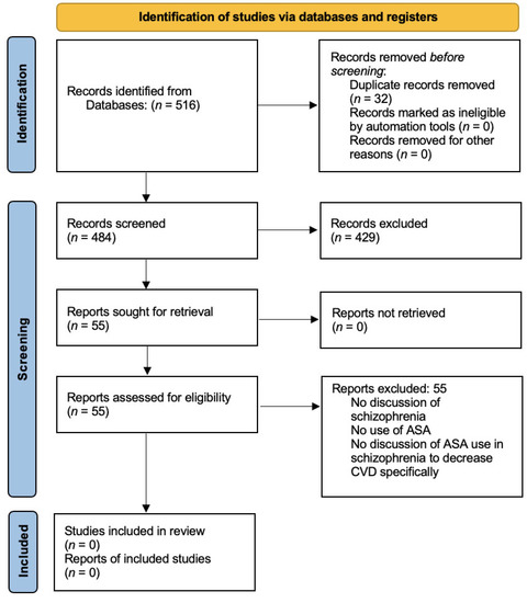 After removal of duplicates, a total of 484 articles were identified and screened. A total of 429 articles were excluded during screening based on their title and abstract not clearly reporting on patients with SCZ spectrum disorder or ASA use. The remaining 55 articles included clinical trials, literature reviews, meta-analyses, opinions, and observational studies. These articles were reviewed by three independent investigators in parallel and independently. All 55 articles were excluded after applying the complete inclusion and exclusion criteria. Nonetheless, there is significant evidence indicating patients with SCZ have an increased risk of CVD due to a variety of factors that we present in the following paragraphs. We also consider that one of the manuscripts yielded by our systematic search is worth presenting in our results. Even though it does not meet our full inclusion criteria, it is the only manuscript published to date assessing the use of ASA in SCZ for purposes related to CVD risk.