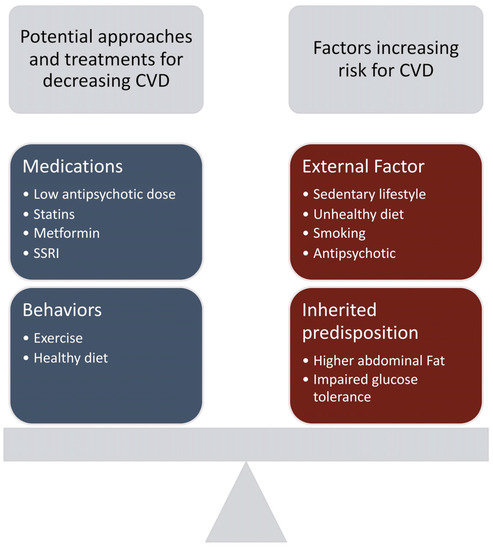 Another factor to consider for the high prevalence of diabetes and CVD risk is antipsychotic intake. Both first-generation antipsychotics (FGA) and second-generation antipsychotics (SGA) have been known to cause metabolic abnormalities [10]. The rate at which these side effects occur is what differs among these medications. For FGAs or typical antipsychotics, lower potency antipsychotics such as chlorpromazine and thioridazine were found to induce greater weight gain than their higher-potency counterparts fluphenazine and haloperidol [19]. However, SGAs or atypical antipsychotics are still more commonly associated with metabolic side effects, especially with olanzapine and clozapine. With clozapine, weight gain lasted for as long as 30 weeks after initiation of treatment, with some patients gaining >30% of their total body weight [19]. Olanzapine also had significant weight gain and can persist for up to 1 year [19]. Weight gain for risperidone and quetiapine appears to be intermediate and associated with dose [19]. Though the mechanism of weight gain via antipsychotic use is currently undetermined, its side effects should remain in consideration when analyzing CVD risk in individuals with SCZ. The factors that increase CVD risk in SCZ patients along with potential treatment approaches to decrease this risk is demonstrated in Figure 2.