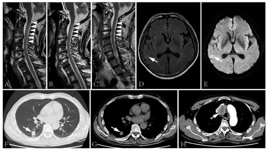 (A–C) Spinal cord MRI showed T2 signal abnormality in the cervical cord at first admission (A), two days after the initiation of intravenous glucocorticoid (B) and second admission (C). The spinal cord lesion shortened after the administration of intravenous glucocorticoid and was merely visible during the second admission. (D,E) T2 flair (D) and DWI (E) images of the brain showed right temporal lobe hyperintensity. (F–H) The CT scan showed a lung lesion (F,G) and a mass lesion with enhancement in the superior mediastinum (H).