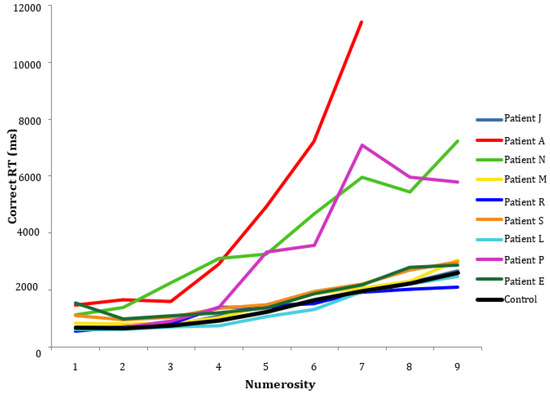 The patients’ response time for correct responses to each numerosity, and the mean for the control group, are shown in