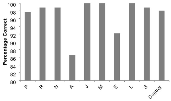 Figure 2, together with the mean for the controls. As can be seen, the controls and most patients performed close to the ceiling on this task, but patients A and E were less accurate.