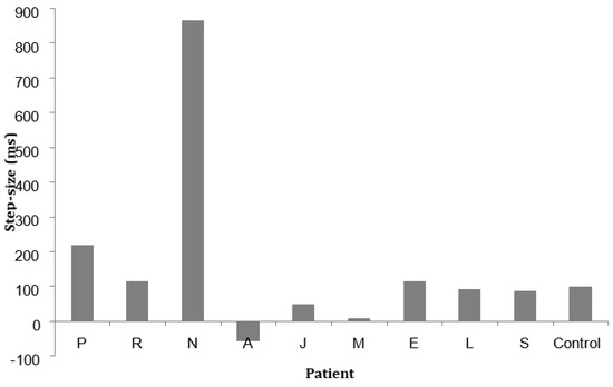 Figure 3, together with the mean for the controls (97.21; sd. 42.58). Most patients showed similar step-size to the controls, with P and especially N showing unusually large differences for two and three dots, and A showing a difference in the reverse direction.