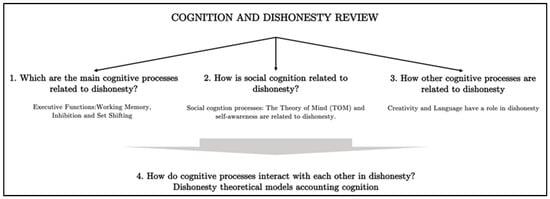 Hence, we have structured the present review while trying to answer the following questions: Which are the main cognitive processes related to dishonesty? How does social cognition modulate dishonest behavior? How are other cognitive processes related to deception? Which cognitive models can help us to understand dishonesty?
