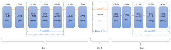 Experimental design: 20 min of anodal, cathodal, and sham tDCS was applied on 3 consecutive days. On day 1, pCASL sequences were collected before the tDCS (pCASL (pre)), during the tDCS (beginning ~6 min into the stimulation; tDCS pCASL (during)), and after the tDCS (pCASL (post)). On day 2, the participants received only the tDCS treatment, and no MRI data were acquired. On day 3, pCASL scans were acquired before the tDCS (pCASL (pre)), and during the tDCS (beginning ~6 min into the stimulation; tDCS pCASL (during)). rs-fMRI: resting-state fMRI; pCASL: pulsed continuous arterial spin labeling.