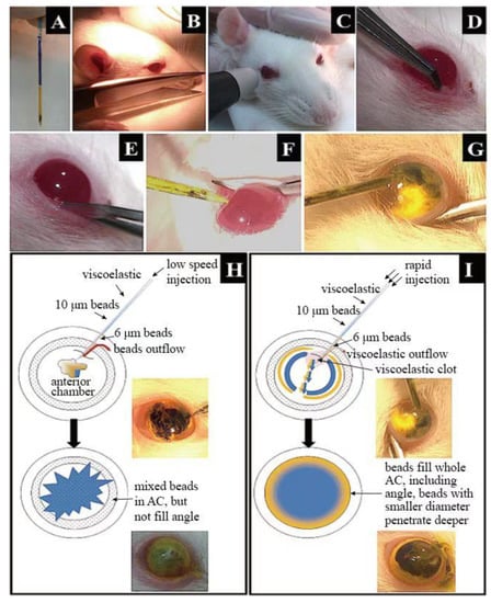 - Microsphere injection: the microsphere injection method uses 10 μm sized latex microspheres to inject into the anterior chamber to prevent the outflow of the aqueous humor and preserve the complete anatomical structure. This method can reduce the inflammatory response. The period whereby high intraocular pressure is maintained is different depending on the size and material of the microspheres. Microspheres of 5–15 μm can raise the intraocular pressure by 5–10 mmHg for 2 weeks [71]. The microsphere method is simple and easy to operate, and the reproducibility is high. At present, the microsphere ocular hypertension model has been widely used in experimental research pertaining to the evaluation of glaucoma drug treatments.