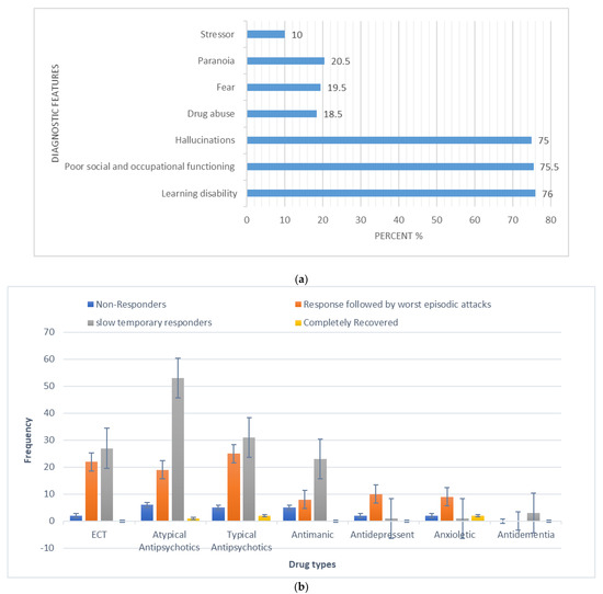 (a) Frequency (%) of diagnostic (core) features in the studied schizophrenia sample (N = 200). (b) Categorization of responses to polypharmacy treatments given to schizophrenia patients in the studied sample (X-axis represents the different types of drugs and Y-axis represents the frequency of occurrence).
