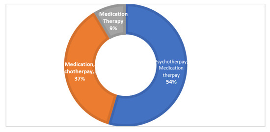 The pie donut chart represents different types of therapies used to treat the studied group of patients. Psychotherapy with medication therapy was given to 54% of the patients, medication therapy, psychotherapy and ECT combined were given to 37% of patients and medication therapy alone was given to 9%of the patients.