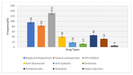 Bar chart depicting the measure of prescription frequency of drugs in the studied sample of 200 schizophrenia patients, representing the comparative higher frequency of antipsychotics (typical 96 and atypical 83) to lower the severity of symptoms in the disorder.