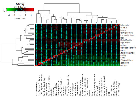 Cluster heatmap showing the correlation between different studied variables. The clusters analysis links the different values on the base of the z-score differences, and the correlated variables are clustered together with the least difference between them. The closely related variables with maximum z-scores are shown in red, while those with minimum z-scores are represented by green. Note: F. History refers to Family history. Antipsychotics refers toatypical antipsychotics.