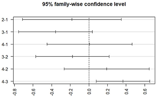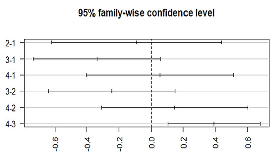 The variation among treatment responses was investigated by using an ANOVA, which showed an association with the typical antipsychotics (p = 0.00128) at a 95% family wise confidence interval. A post-hoc Tukey analysis further identified the differences between groups (Figure 5), which showed that a significant difference lies (p-adj = 0.003) between group 3 (episodic response followed by worst episodic attacks) and group 4 (completely recovered). Similarly, a significant association exists between the medication response and the combination treatment (ECT and antipsychotics) (p = 0.00258, F = 4.981). The Post-hoc Tukey HSD analysis further identified a difference within the medication response categories. A significant difference exists between group 3 (episodic response followed by worst episodic attacks) and group 4 (completely recovered) (p-adj = 0.006), and no significant variation among the treatment responses was observed with other prescribed drugs, which include atypical antipsychotics, anti-manic, antidepressants, anxiolytics, and depot injection (Figure 6).
