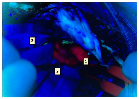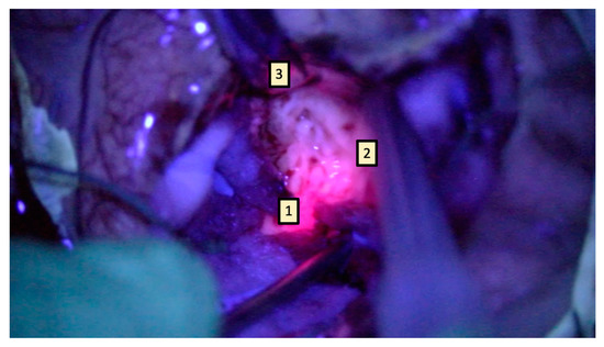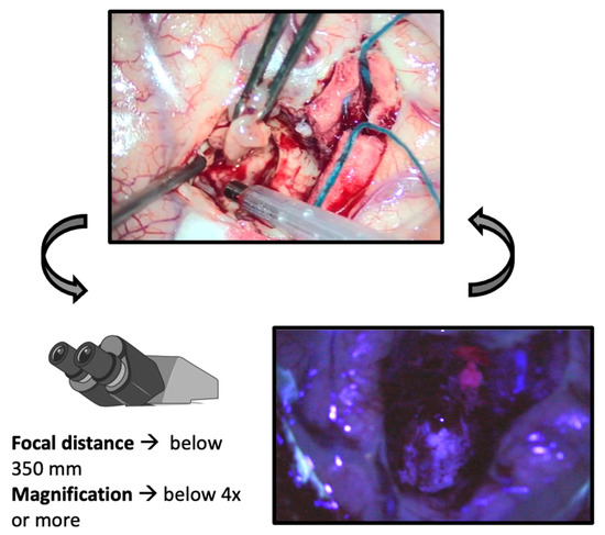 This paradigm changes only when using an exoscope instead of a surgical microscope. With the latter, fluorescence is captured under blue filter and transferred via digital video chip technology, and processed and projected via an optimized data transfer link, on high-resolution monitors [9]. This mechanism allows for high-quality image capture under very low light conditions, easing the simultaneous visualization of fluorescence and anatomy and enabling the surgeon to proceed with resection directly under blue light, even in cases of deep-seated lesions, potentially modifying the classical surgical workflow (Figure 2) [11,12].