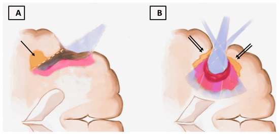 Long working corridors, deeply seated or irregularly shaped lesions, and surgical cavity edges can create dark corridors not allowing the microscope to elicit fluorescence from pathological tissue. (A) Shows the difficulties in identifying the remnants on the top left of the resection cavity (arrow). (B) During the final inspection, the microscope should be angled to extreme positions (double arrows) to achieve a complete exploration of surgical cavity edges.