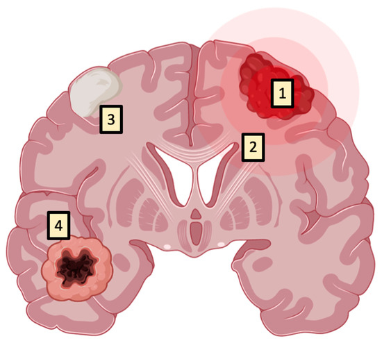 Fluorescence has also been observed in non-oncological settings, such as in multiple sclerosis, neurodegenerative diseases, and infectious conditions. Notably, all of these conditions share a conspicuous number of immune cells which, as mentioned before, can display fluorescence due to 5-ALA uptake and metabolism. In addition, the macroscopic fluorescence in bacterial brain abscesses could be explained by the bacteria capability to elaborate porphyrin precursors, since they are useful cofactors for their growth [19,20,21] (Figure 6).