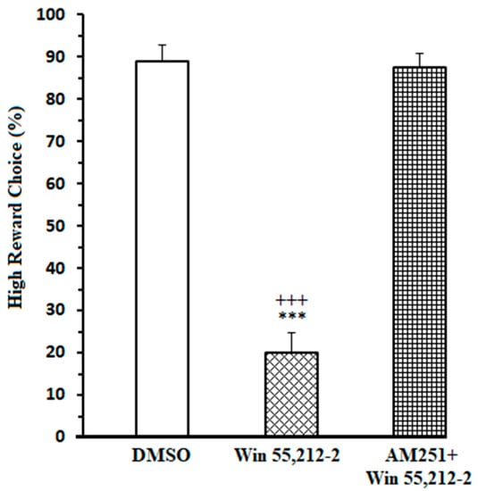 To make a successful decision, comparing the costs of a given option to its related benefits is required []. As an essential element for modulating synaptic action, endocannabinoids regulate an extensive range of brain actions such as memory, pain processing, and stress reaction. They have also emerged as a crucial regulator of effort-based decision-making [,,]. The endocannabinoid system is a neural substrate implicated in decision-making behavior and partly affects decision-making by inhibiting the activity of inhibitory and excitatory neurotransmission along the mesocorticolimbic pathway []. Indicatively, both systemic injection and administering into the NAc of a cannabinoid receptor agonist disrupted effort-related decision-making behavior [,,].