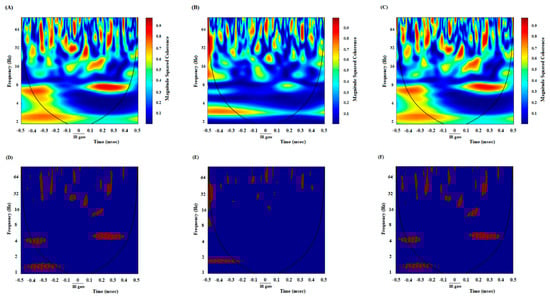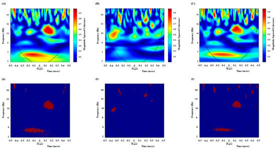 Comparison of coherence of group averages between high remuneration/high endeavor trials in the control group (A), low remuneration/low endeavor trials in the agonist-treated group (B), and high remuneration/high endeavor trials in the antagonist-treated group (C) during reaching remuneration. Time-frequency representation of group averages coherence between the ACC and NAc for n = 53 trials. The cone of influence (COI) where edge effects should be considered is blurred. It should be noted that the wavelet scales are converted to approximate frequencies on the graphs. Comparison of areas in which the coherence is significantly different compared to a large number of surrogate data between high remuneration/high endeavor trials in the control group (D), low remuneration/low endeavor trials in the agonist-received-group (E), and high remuneration/high endeavor trials in the antagonist-received group (F) while reaching a remuneration. The red regions in the figures show the areas with a significant difference (p < 0.05). Surrogate data were simulated using bootstrapping (n = 1000).