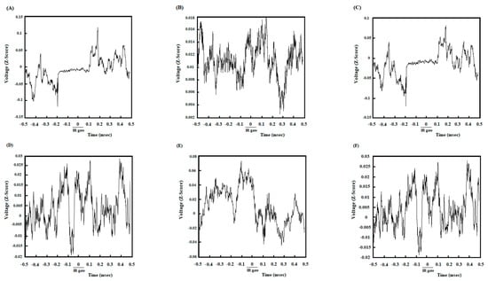 Z-normalized time-domain signals of ACC. The group’s time-domain averages signal acquired from ACC in control animals (A), agonist-treated animals (B), and antagonist-treated animals (C) while reaching a remuneration. Z-normalized time-domain of group averages signals acquired from the NAc. The group’s time-domain averages signal acquired from NAc in the control group (A), the agonist-treated animals (B), and the antagonist-treated animals (C) while reaching a remuneration. The group’s time-domain averages signal acquired from NAc in the control group (D), the agonist-treated group (E), and the antagonist-treated group (F).