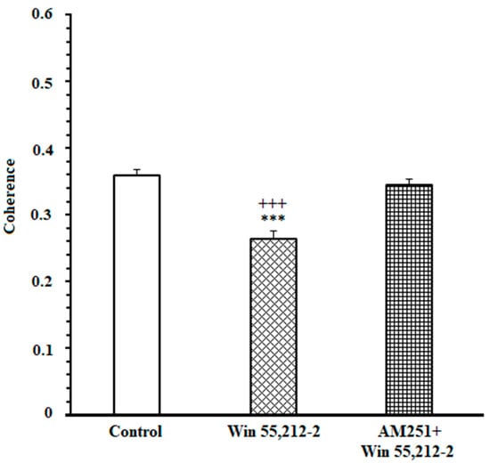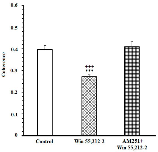 Mean ± SD of coherence in 1000 ms time window (500 ms before and 500 ms after cutting the beam of the infrared sensor). *** p < 0.001 different from the control group. +++ p < 0.001 different from the CB1 receptor antagonist + agonist group.
