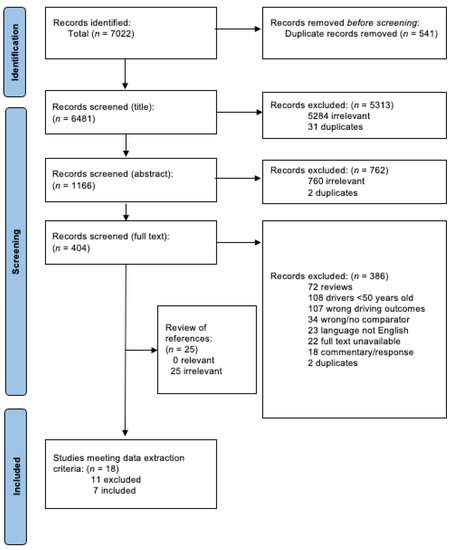 During the data extraction process, 11 additional studies were excluded due to MVC or culpability data being unavailable for older adults. Data extraction was completed for seven studies [29,31,32,33,34,35,36], all of which were observational in design. Reference list scanning did not result in the inclusion of additional studies. Data request letters were sent to corresponding authors of studies that did not report findings specific to older adults. Four of 47 authors replied with the relevant data: Jørgenrud et al. [32], Brubacher et al. [34], Poulsen et al. [35], and Chihuri and Li [36] all provided usable data specific to adults aged 50 and older.