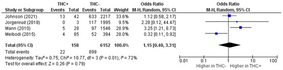 The first of our two primary analyses examined the effect of THC exposure on MVC risk in older drivers and included four studies [29,31,32,33]. The pooled risk of MVC was not significantly different between older adult drivers who were exposed to THC and those who were not (OR, 95% CI 1.15 (0.40, 3.31)) (Figure 2). We noted significant heterogeneity among the studies (I2 = 72%, p = 0.01) (Figure 2). Three of the four studies point in the direction indicating that cannabis use is associated with an increased risk of MVCs, [31,32,33] though Mann et al. [33] was the only study that had statistically significant results. Conversely, Kalantari Meibodi et al. [29] concluded that MVC risk was significantly greater among THC-negative drivers compared to THC-positive drivers. Confidence intervals varied dramatically between studies with Kalantari Meibodi et al. [29] having a relatively small range and Jørgenrud et al. [32] having a very large range. Based on visual inspection of the funnel plot (Figure S1), there did not appear to be any publication bias among the studies of MVC risk.