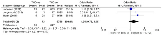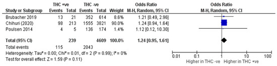 THC and its metabolites can be detected in the blood, saliva, and urine using various immunoassay and chromatographic techniques [42]. Four of the seven included studies used blood samples to detect the presence of THC [31,34,35,36]. Of these, Brubacher et al. [34] and Poulsen et al. [35] stated that their limits of detection were 0.2 ng/mL and 0.3 ng/mL, respectively. Two studies used oral fluid samples [31,32]. Only two of the seven studies quantified THC concentrations in the samples rather than simply reporting the absence or presence of THC [34,35]. One study used urine samples [29], and one study used self-report questionnaire data [33].