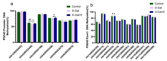 Chicago/Turabian StyleZhang, Jinmei, Qiaojing Gao, Jun Gao, Liting Lv, Renfan Liu, Yi Wu, Xue Li, Yu Jin, and Lu Wang. 2023. "Moderate-Intensity Intermittent Training Alters the DNA Methylation Pattern of PDE4D Gene in Hippocampus to Improve the Ability of Spatial Learning and Memory in Aging Rats Reduced by D-Galactose" Brain Sciences 13, no. 3: 422. https://doi.org/10.3390/brainsci13030422
