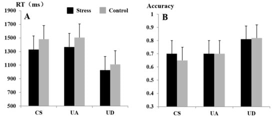 Behavioral data were collected by E-prime 2.0. The SPSS17.0 software (International Business Machines Corporation, New York, NY, USA) generated descriptive statistics for reaction time and accuracy under stress and control conditions. A 2 (stress/control) ×2 (male/female) × 3 (CS/UA/UD) repeated measurement analysis of variance was conducted with reaction time to identify the different effects among the conditions. Differences in accuracy (percentage) were tested with chi-square analysis.