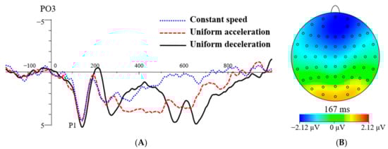 The brain area MT (Middle Temporal) is not only a key structure in the analysis of object speed but also in the analysis of the depth perception and direction of motion [1,25]. Speed tuning in MT could be primarily inherited from V1 [26]. Speed and direction are separated from other attributes of motion (such as spatial frequency) in the early stages of vision [27]. Patients with MT lesions cannot perceive movement stimulation with a speed exceeding 6°/s [28]. Regarding the ERP component of speed perception, previous research used the electroencephalogram (EEG) method to explore differences in speed perception across three driving speeds (25, 50, and 75 km/h) and found activity in the N2 component in the middle temporal area. There were significant differences in the N2 peak latency and peak amplitude among the three speeds [29]. ERP components related to speed perception also include P1 and slow wave potentials (SW). The P1 component of the temporo-occipital region was related to visual information processing of the speed perception stimulus [30]. SW mean amplitudes of the frontal area were easily affected by memory load [31].