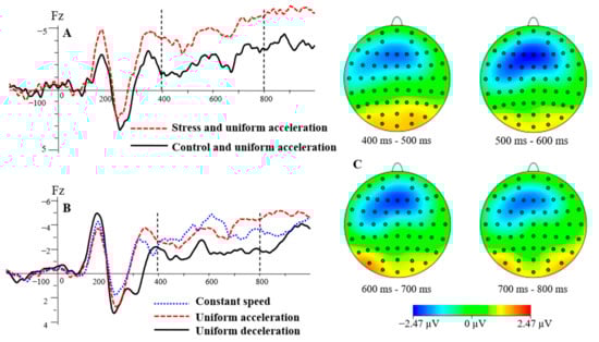 This study found that there was a larger investment of cognitive resources under stress. The SW mean amplitude during speed perception was significantly lower under the control condition than that under the stress condition. Previous research showed that SW is an ERP component that represents the representation of visual working memory [56]. The long-lasting negative diffuse wave reflects an ERP component activated during the visual–spatial information coding process [57]. SW has been shown to be a component related to the coding stage in memory and its distribution in the brain varies with sensory channels and stimulus types [58]. It can be seen in earlier research that SW is a late component closely related to the information coding of visual space stimuli and the representation of visual working memory. The mean amplitudes of SW are affected by memory load [31]. The current results found that the mean amplitude SW was closely correlated to the consumption of cognitive resources. The lower the SW mean amplitude, the fewer cognitive resources were consumed. Therefore, subjects needed to pay more cognitive resources in the process of discerning the type of motion in the stress condition. In addition, the SW mean amplitude evoked by the perception of UD was lower than that of UA and CS. Referring to [5,6], the contrast of UD was larger than that of UA and CS. Therefore, attention was easily attracted to UD. In addition, the extraction speed of working memory was faster in UD, which needed lower cognitive resources. Similarly, Schlack et al. (2008) found that the perception of an accelerating object’s speed was slower than their perception of a decelerating object’s speed [59]. The results in the current study also showed that people were better at judging deceleration motion, which was reflected in the lower cognitive resources required to identify UD.