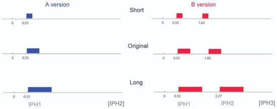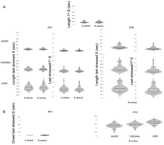 IPH boundaries (rectangles represent last stressed syllable of each IPH) at A and B versions, for short vs. original vs. long stimulus sets. For EEG analysis, IPH2 boundaries in A versions were copied from B versions.