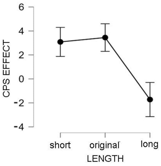 The repeated measures ANOVA with length, caudality and laterality as factors, and the CPS effect ((B–A at IPH2)—(B–A at IPH1)) as dependent variable (Figure 3) showed a significant main effect of length, F(1,40) = 3.40, p < 0.038, ηp2 = 0.078, without further interactions with topographical factors. Positive values for short and original indicated the expected effect (B–A at IPH2 greater than B–A at IPH1), while the negative values for long suggest that the effect is, at least, absent.
