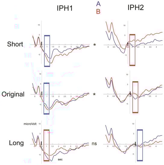 Triggers were placed at the onset of each sentence, in line with previous approaches to CPS []. However, since we noted early divergences between A and B versions in this scenario, we adopted new, IPH-related baselines, by applying baseline correction to each trial at the 200 ms period preceding the two relevant events (see Results: the minimum boundary onset time for IPH1 (common to short, original and long), and the same for IPH2 (different time points across length conditions). We then extracted the time window between 150 ms and 650 ms post-boundary onset for both IPH1 and IPH2 and ran the statistical analysis. The IPH2 trigger point was based on B versions, where the boundary was present (Figure 2), and it was applied to the A versions. Thus, at this point, we were comparing presence (B) vs. absence (A) of a boundary.