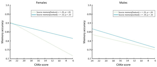 Source memory accuracies as a function of CAKE scores for females (left) and males ((right); correlation values and p-values at the upper right of each panel). Reprinted from Brain and Cognition, 166, Haley A. Fritch, Lauren R. Moo, Madeline A. Sullivan, Preston P. Thakral, and Scott D. Slotnick, “Impaired Cognitive Performance in Older Adults is Associated with Deficits in Item Memory and Memory for Object Features”, 105,957, copyright (2023), with permission from Elsevier.