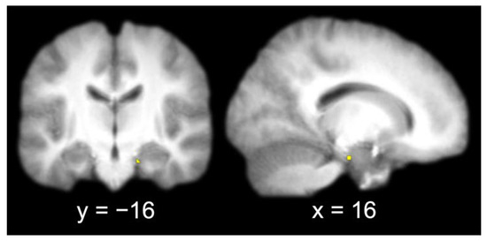 Across all the participants, there were several regions functionally connected to the entorhinal cortex (Table 1 and Figure 4), including the prefrontal cortex (right IFG; middle two panels, top right lateral), visual-processing regions (bilateral V1, bilateral cuneus, and left lingual gyrus; right three panels, bottom), the right insula (right three panels, top right lateral–medial), and the right putamen (left three panels, top right medial). Three activations produced by the group connectivity analysis (i.e., the right IFG/insula, the right V1/bilateral cuneus, and the left V1/lingual gyrus) were selected to test the effect of sex, based on previous findings [5,6,7].